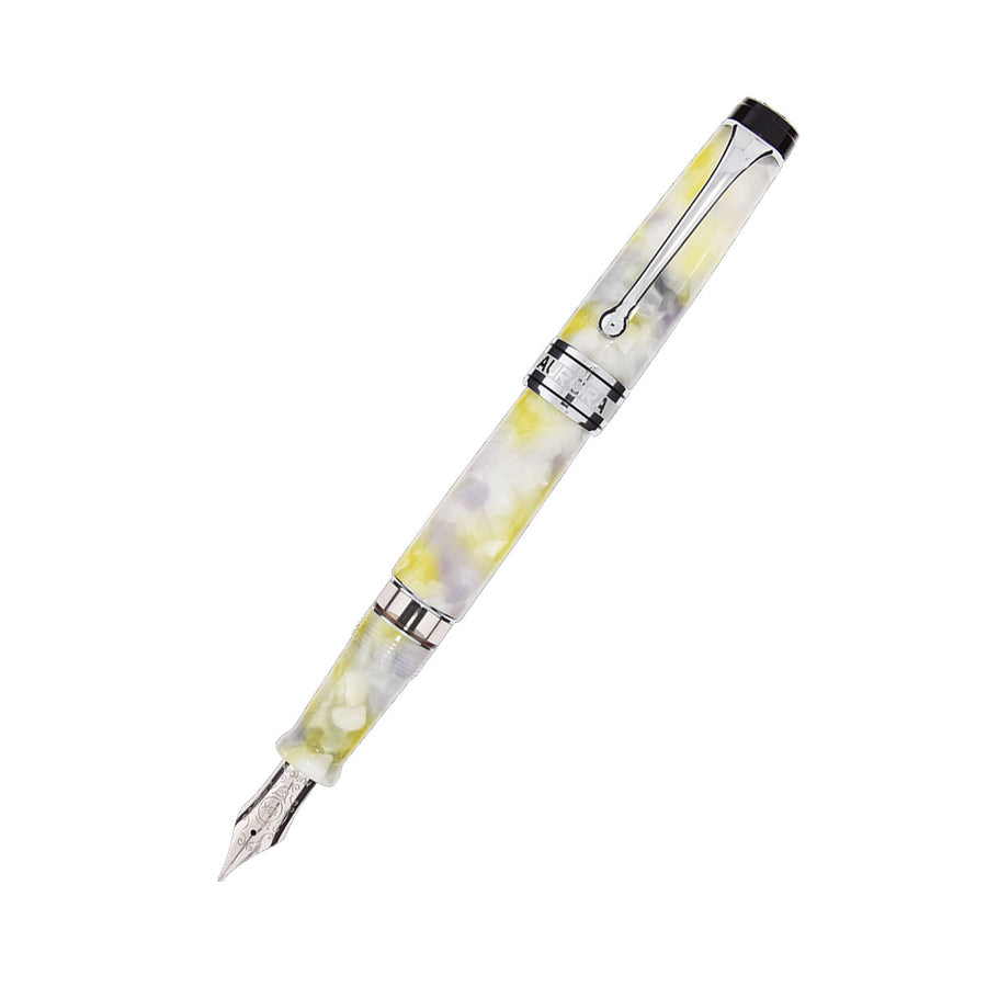 Fountain pen in white, yellow, and lilac marbled Auroloide, featuring a rhodium-treated 18kt solid gold nib and chrome trims Limited Edition to only 860 pieces.