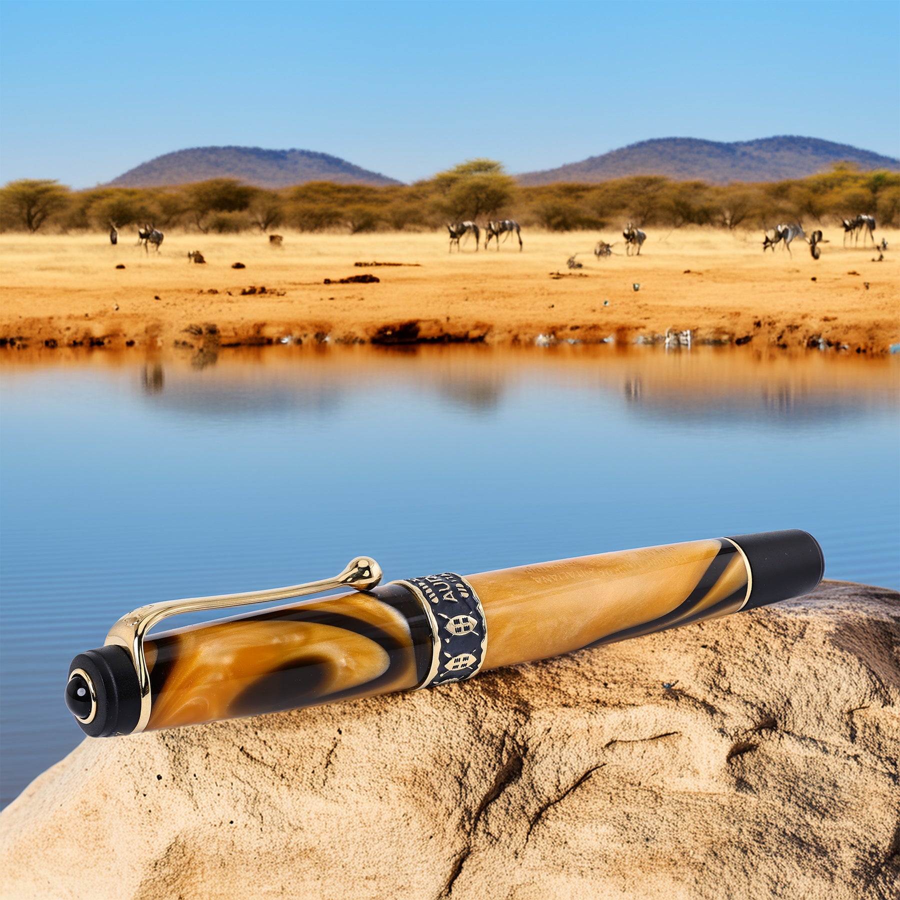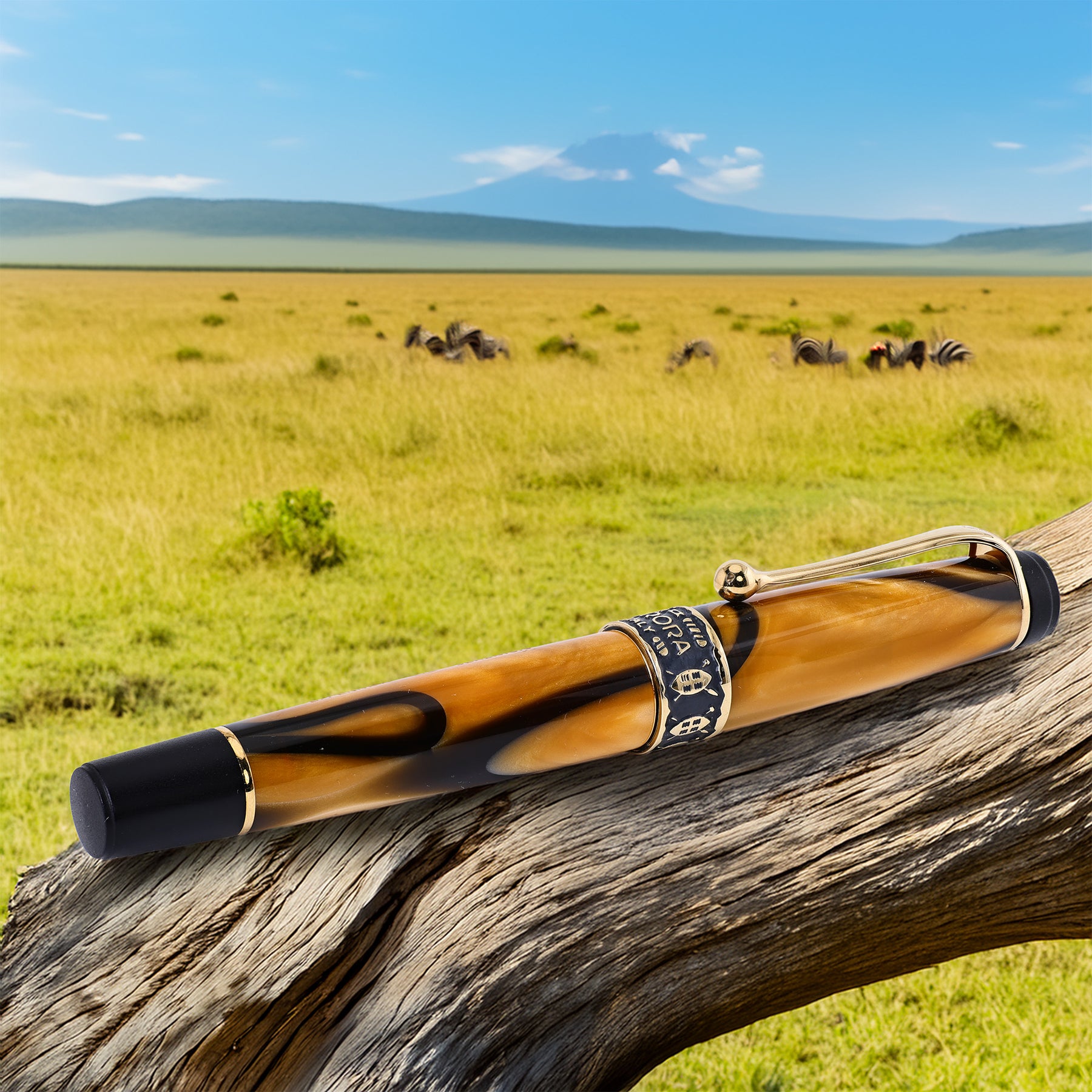 The collection embodies the diverse landscapes of Africa, utilizing warm, earthy tones reminiscent of the Savannah, Serengeti, Sahara, Kilimanjaro, and iconic landmarks like the Pyramids. This limited production run consists of 7,500 fountain pens. This one #2337/7500