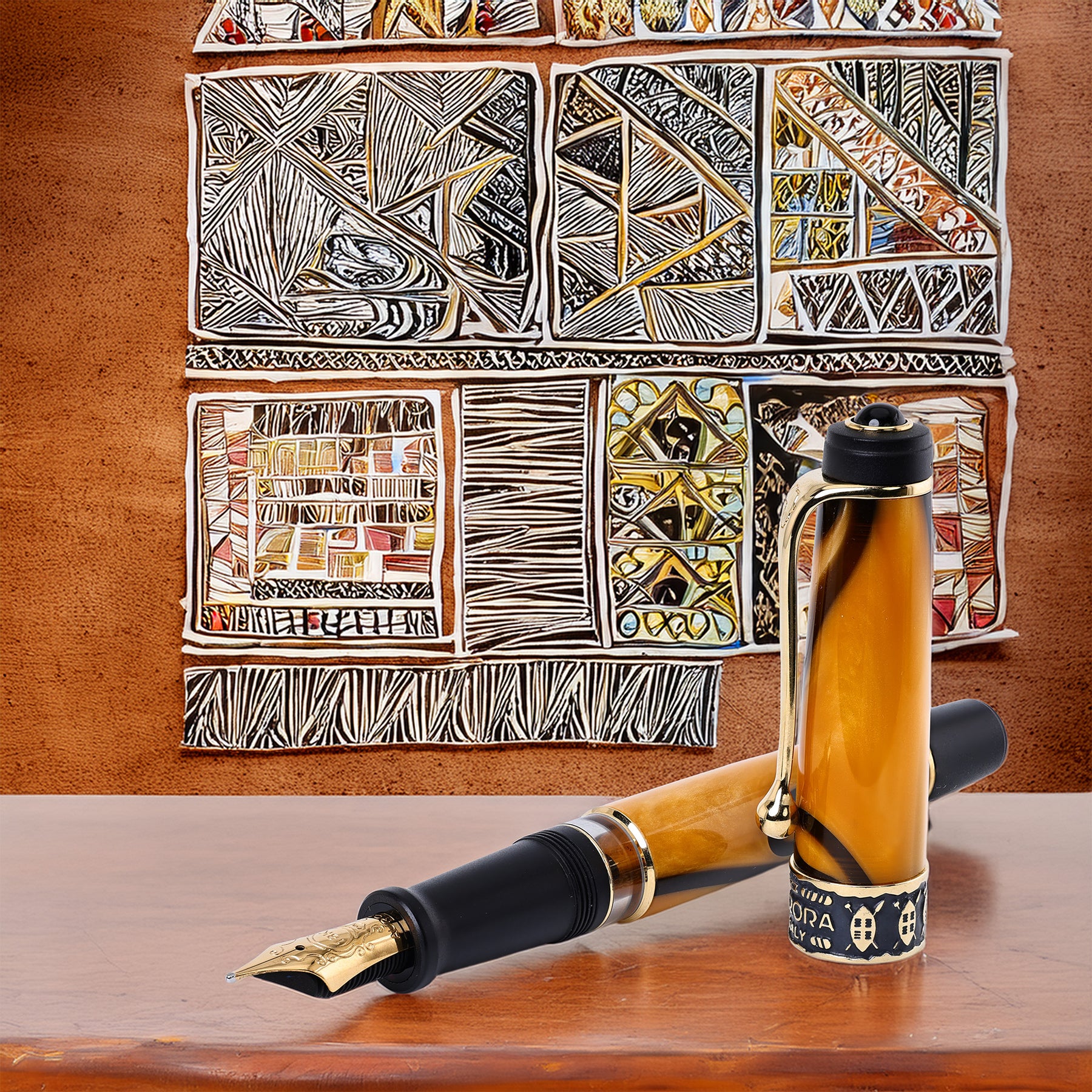 Each pen in the Afrika series features a genuine Onyx gemstone inset in the black cap top and a uniquely designed clip bearing the engraved profile of the African continent. The cap and barrel, crafted from marbled "land-of-Afrika" resin, are complemented by gold-plated trims. The barrel is further embellished with precision-cast, gold-plated rings, engraved with shields and symbols derived from traditional African art. This collection represents a refined blend of cultural inspiration and superior craftsmanship.