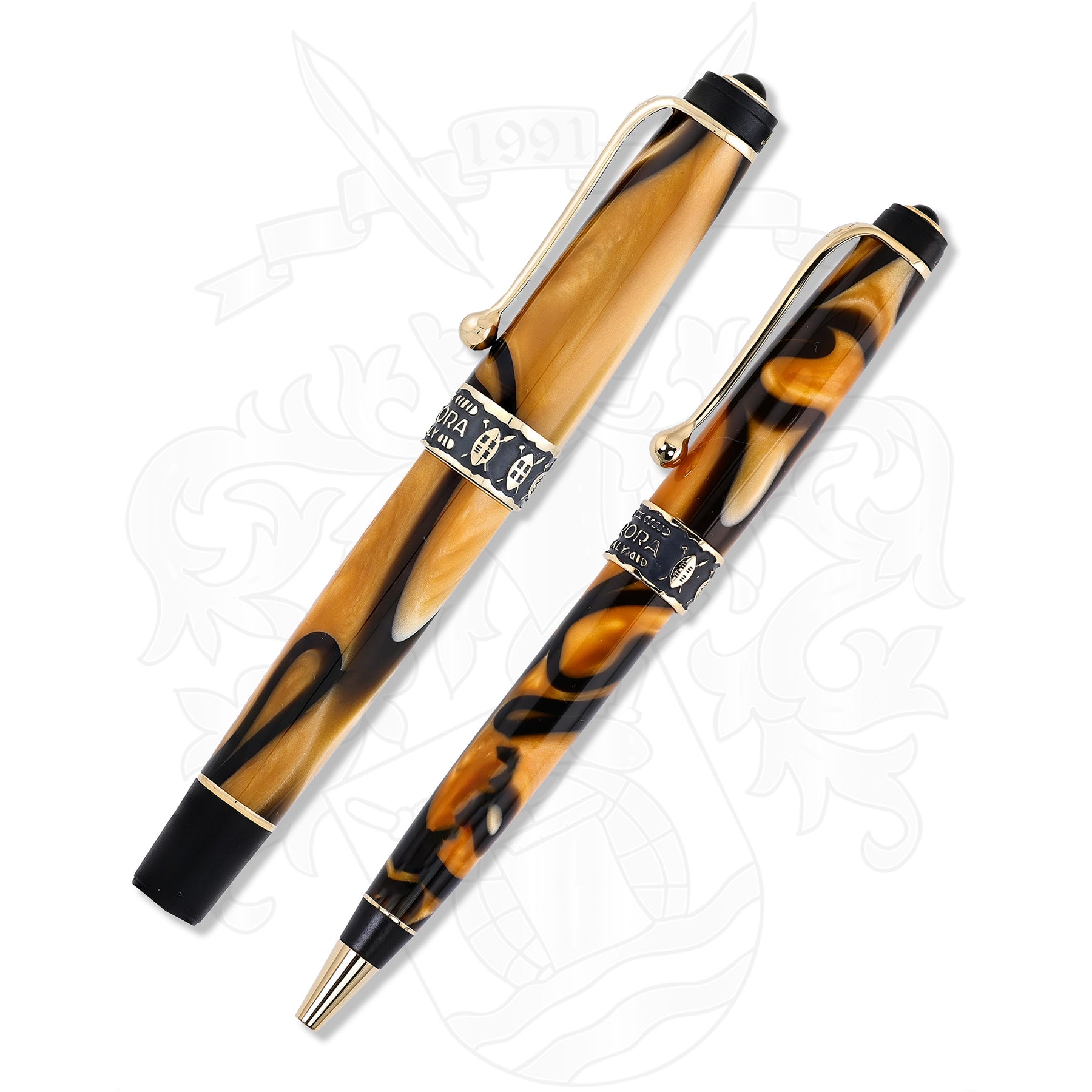 The Aurora Afrika Limited Edition Fountain Pen and Ballpoint pen Set presents a meticulously crafted collection inspired by the rich tapestry of the African continent. This numbered series, available in a distinctive marbled "land-of-Afrika" resin and gold finish, caters to discerning writing enthusiasts and collectors.