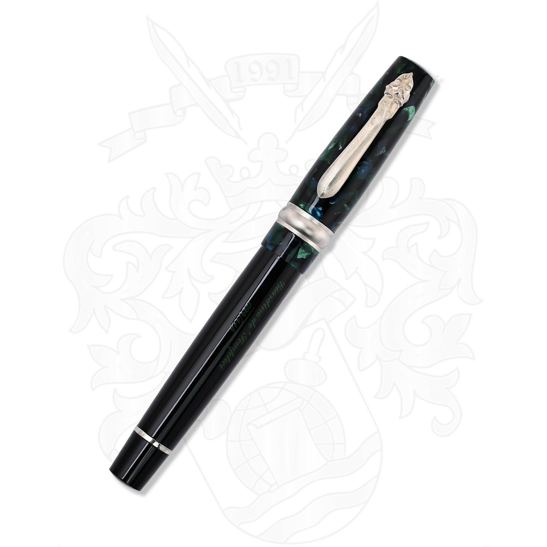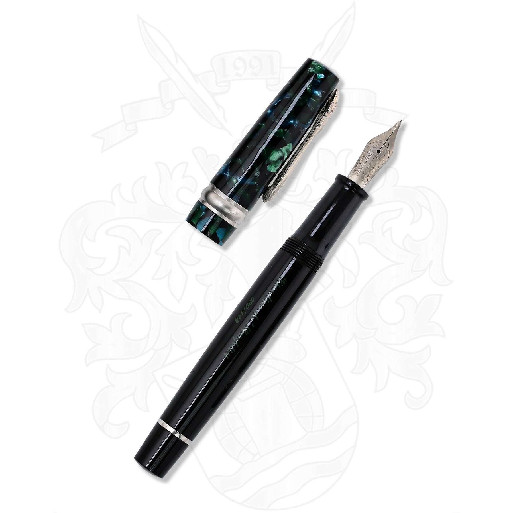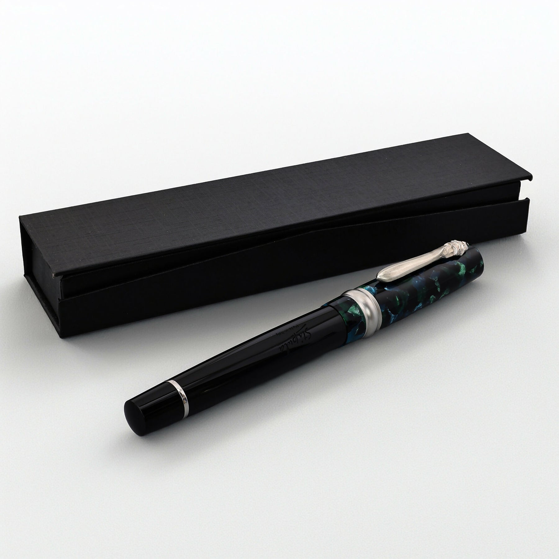 • Unique Material Blend: The pen features a sleek black resin barrel contrasted by a cap in marbled blue-green celluloid, evoking the lush, hidden depths of an Italian garden.