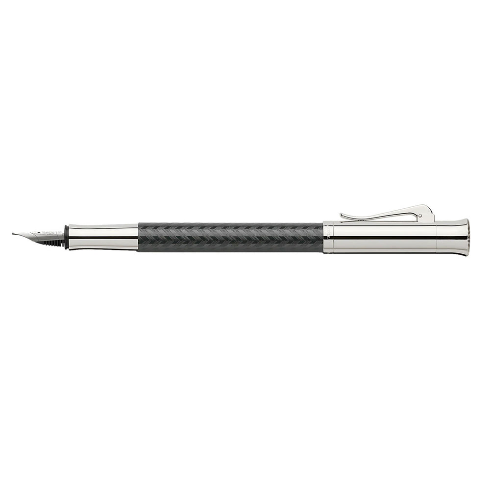 The barrels of these new and colorful Writing Instruments are made from especially hard wearing materials. They have a special guilloche pattern engraved on them that is normally reserved for jewelry or silver accessories. Manual polishing and special lacquering processes provide the special optical effect. All metal parts are finished in high quality rhodium plating. The Guilloche range of Writing Instruments are available as fountain pens, rollerball, ballpoint, or propelling pencil. Beautiful colors are available in each, such as black, indigo, coral, cognac, or rhodium finished metal. The Guilloche handcrafting process creates more than just an interesting surface structure; it creates a Writing Implement that stands through its quality and uniqueness. The fountain pen is equipped with a practical cartridge convertor system and a handmade 18k gold nib with an iridium point. The rollerball pen features a precision ball that glides smoothly on the paper. The pencil uses a 0.7mm lead of grade B with a reservoir for spare leads. Under the removable cap, you will find a non-smudge white eraser of the highest quality for no-mark-left erasing. The Guilloche Line comes in an elegant gift box with a magnetic catch, and each pen is presented in a linen bag. The Black Chevron Guilloche Collection shows a filigree herring bone engraving pattern. The word Chevron refers to the French word indicting a “V” shape or “zig-zag” pattern. After engraving, the surface has been painstakingly polished to a high gloss giving the Guilloche Chevron an exciting shiver that takes on the new character depending on the angle of the light.