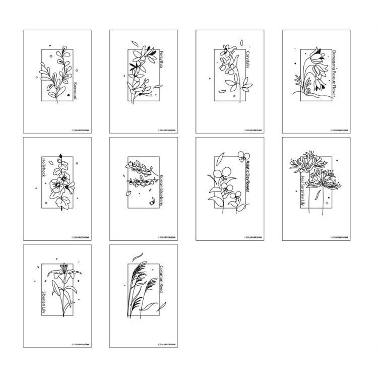 The Colorverse Ink Art Cards Colorspace Wildflower (Size B) set includes 40 illustrated cards inspired by wildflowers that bloom throughout Korea’s seasons. Each card features a unique illustration of a specific wildflower, for a total of 10 different designs (4 copies of each).