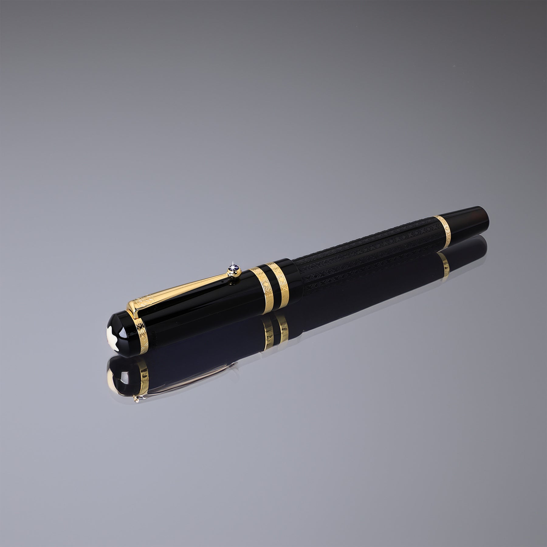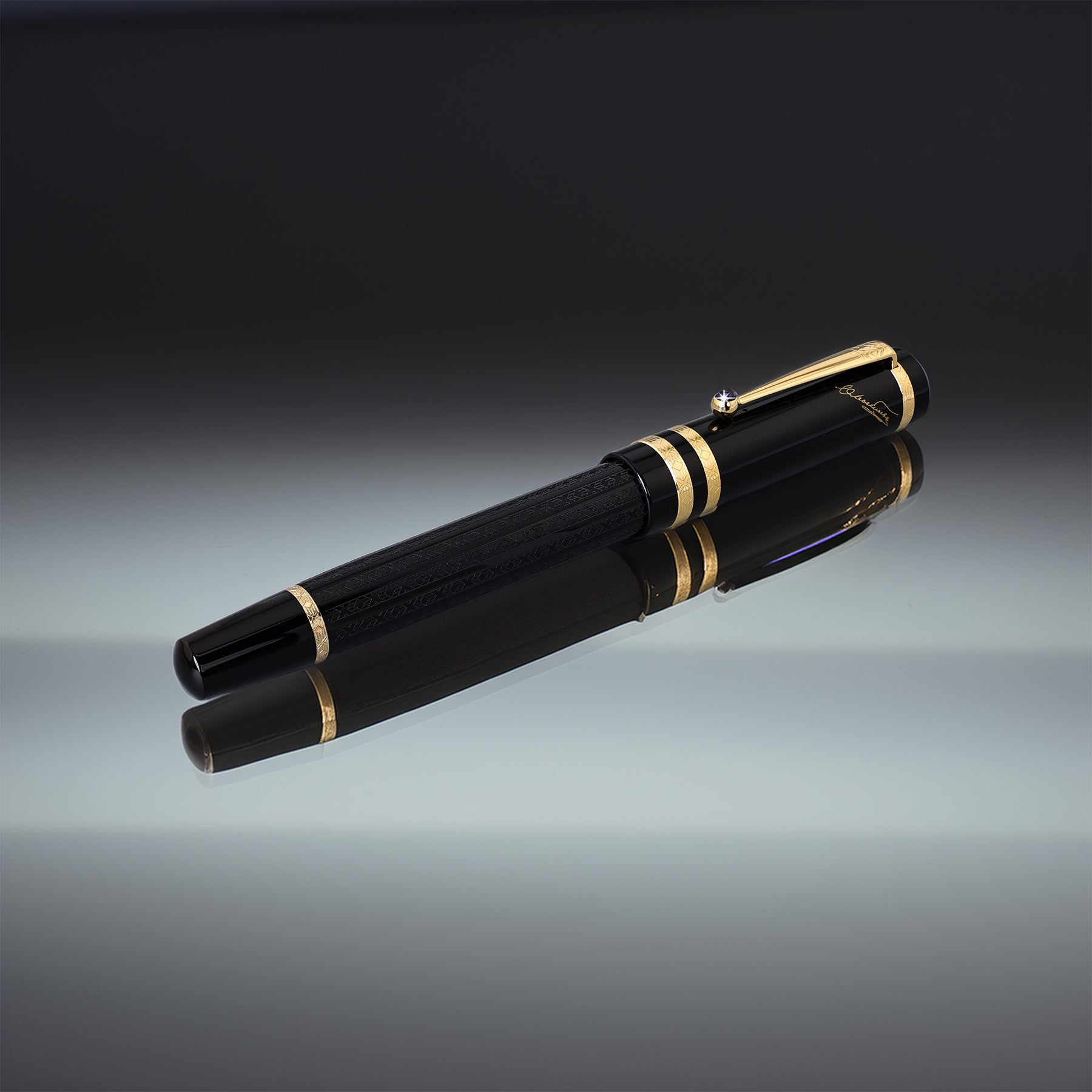 The pens are made from a rich black resin, symbolizing the intense and often dark themes of Dostoevsky’s writings. The cap and barrel feature intricate guilloche patterns inspired by Russian architecture, adding a touch of historical and cultural authenticity. Gold-coated fittings provide an elegant contrast, while the clip, adorned with a single sapphire blue gemstone, represents the deep introspection found in Dostoevsky's works.
