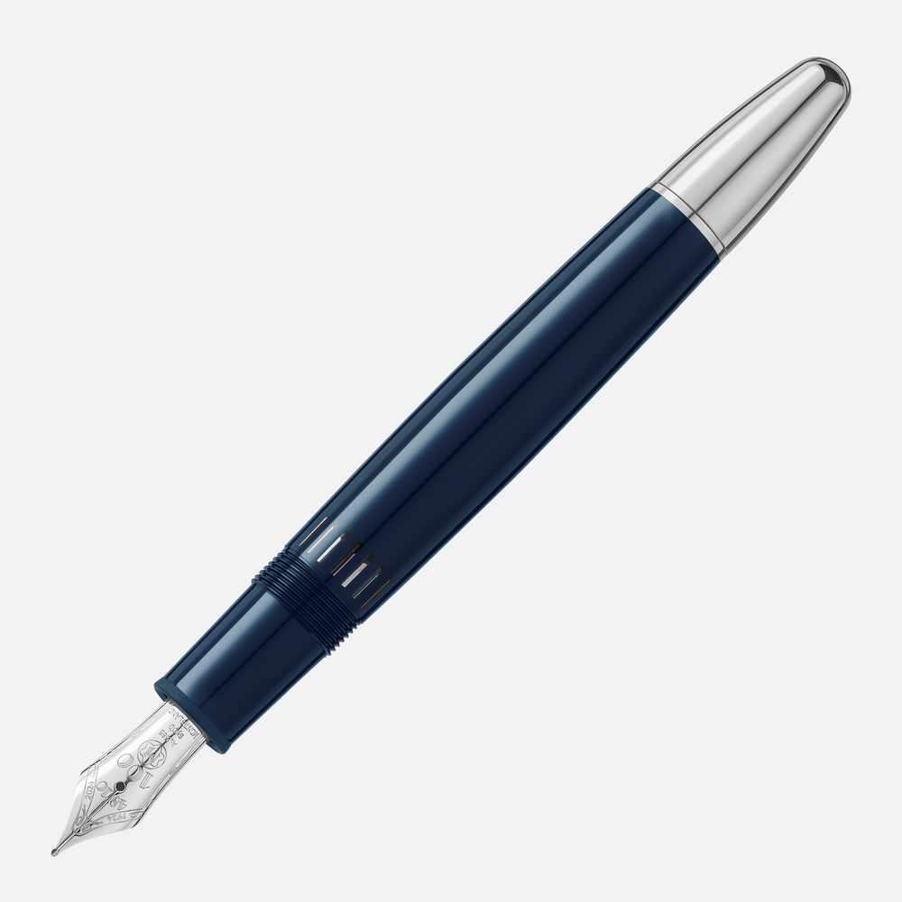 Montblanc Meisterstück 146 The Origin Collection Precious Resin LeGrand pairs a dark blue precious resin fountain pen barrel with a blue fluid ink effect cap. The Montblanc emblem that crowns the writing instrument is embedded in precious blue resin, while the nib is crafted from rhodium-coated solid Au585 gold nib.