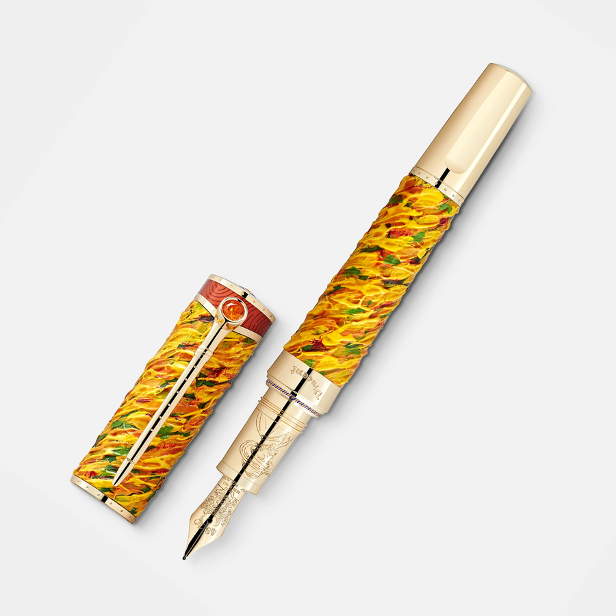 The famous series of five sunflower paintings inspired the interpretation embossed on the handcrafted Au 750 solid yellow gold nib. As homage for Vincent's fascination of traditional Japanese woodblock prints, the overall shape is inspired by a Japanese woodcutting knife.