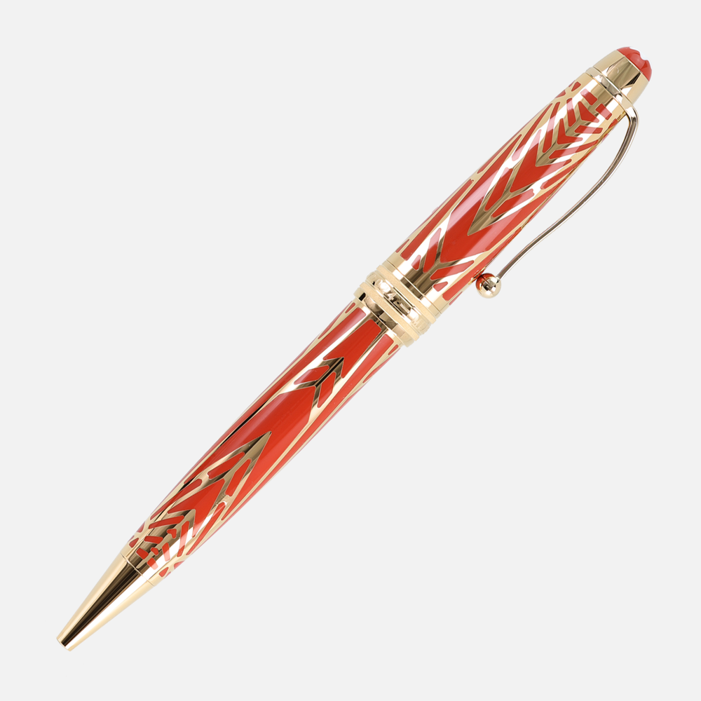 The bent clip on the edition with a clip drop is an homage to the many different clip versions that existed during the 1920s when clips were not fixed to a writing instrument, but could be chosen by customers from a range of different clips.  Inspired by the different marble effects in the early Meisterstück writing instruments, the precious resin of the cap displays an effect reminiscent of dissolving ink that has purposely been adapted to today’s more advanced production techniques. To honour the original sources that inspired the design of the Meisterstück The Origin Collection, each emblem is surrounded by the respective colour of that edition.