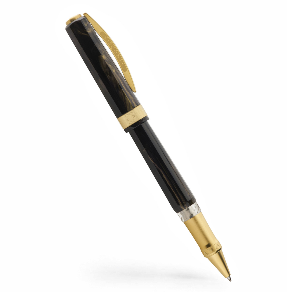 Each pen features details reminiscent of early Visconti designs. The classic ‘squaring the circle’ shape, a luxurious matte gold finish with detailed engravings and an abundance of innovation. Available in fountain pen, rollerball, and ballpoint.