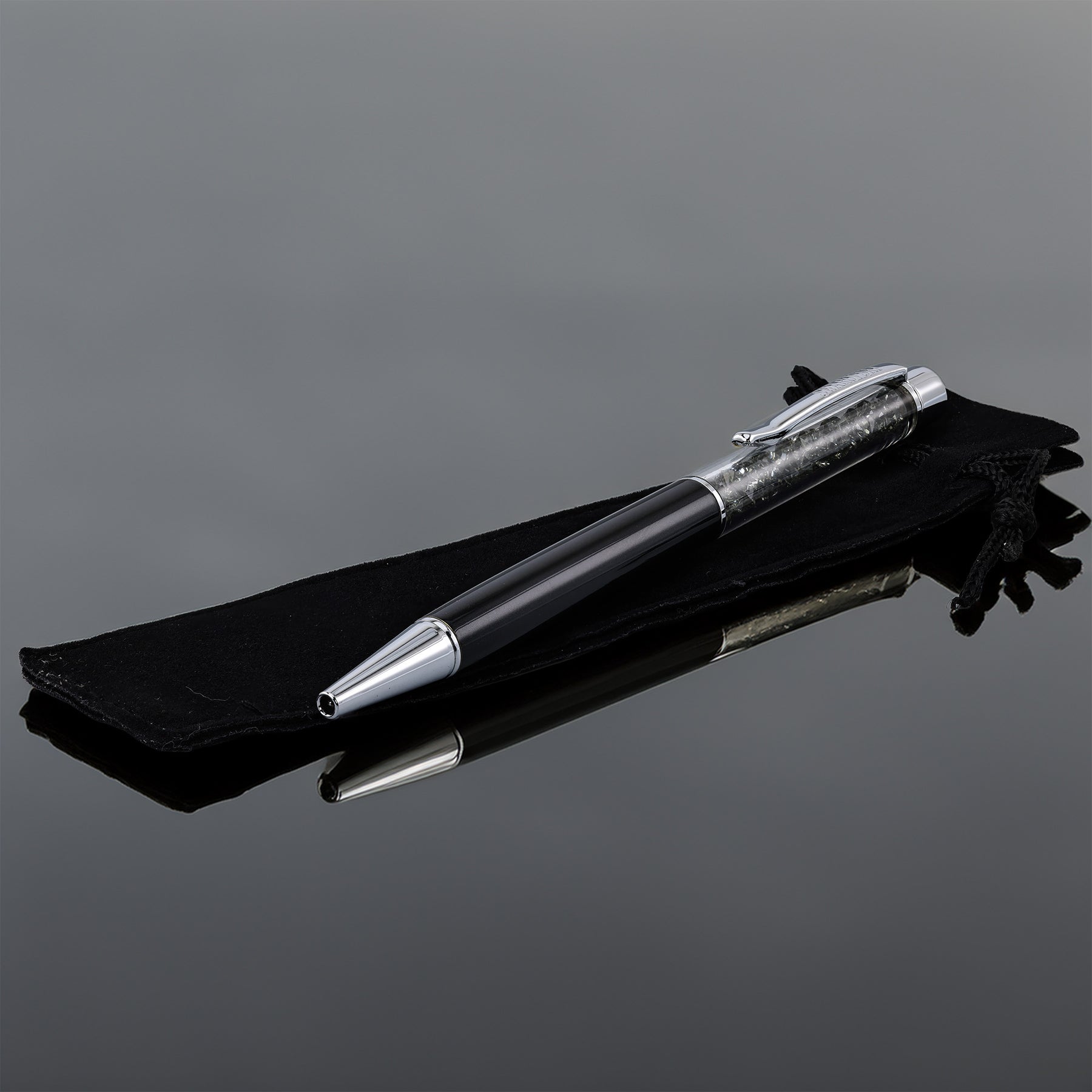 This gorgeous Swarovski pen features crystals that give it a spectacular shimmer above a barrel of shiny black lacquer.