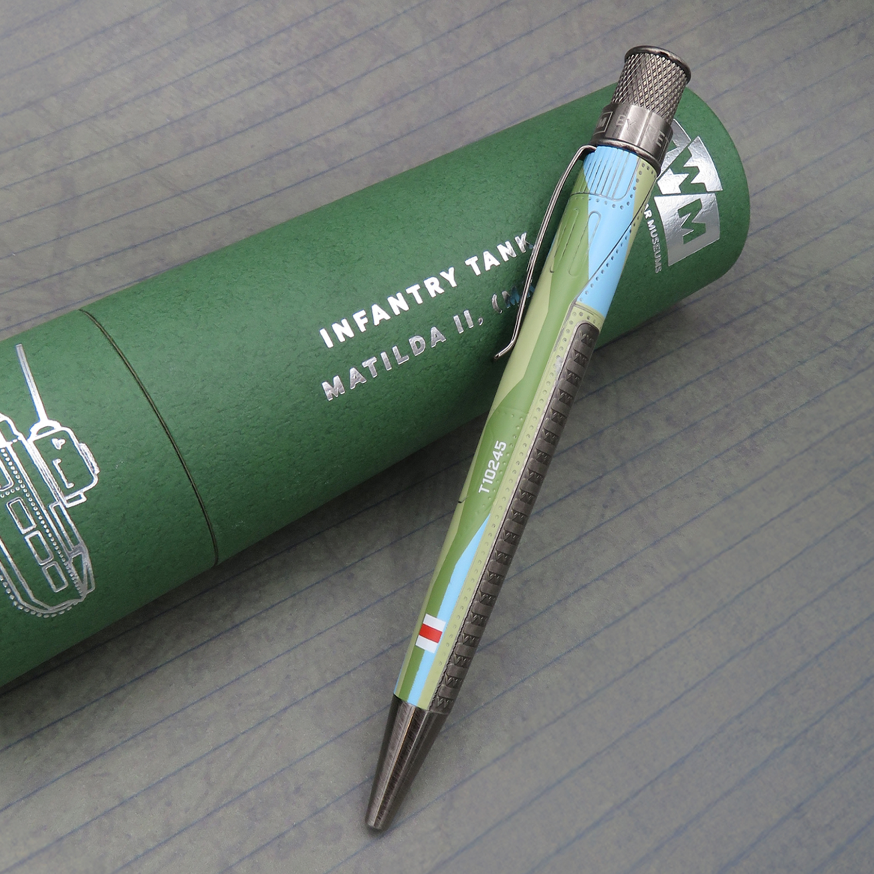 Unleash your daring spirit with this impressive addition to Retro 51's Imperial War Museums (IWM) Collection: the Matilda Infantry Tank rollerball. This writing instrument is not just a pen, it's a powerful symbol of World War II's iconic armored vehicles. Combining acid-etching and printing techniques, this Tornado™ rollerball captures the essence of the tank, from its armor panel lines to the rugged texture of its riveted steel plating. Let your fingers explore the barrel and experience the quality and determination of wartime engineering.
