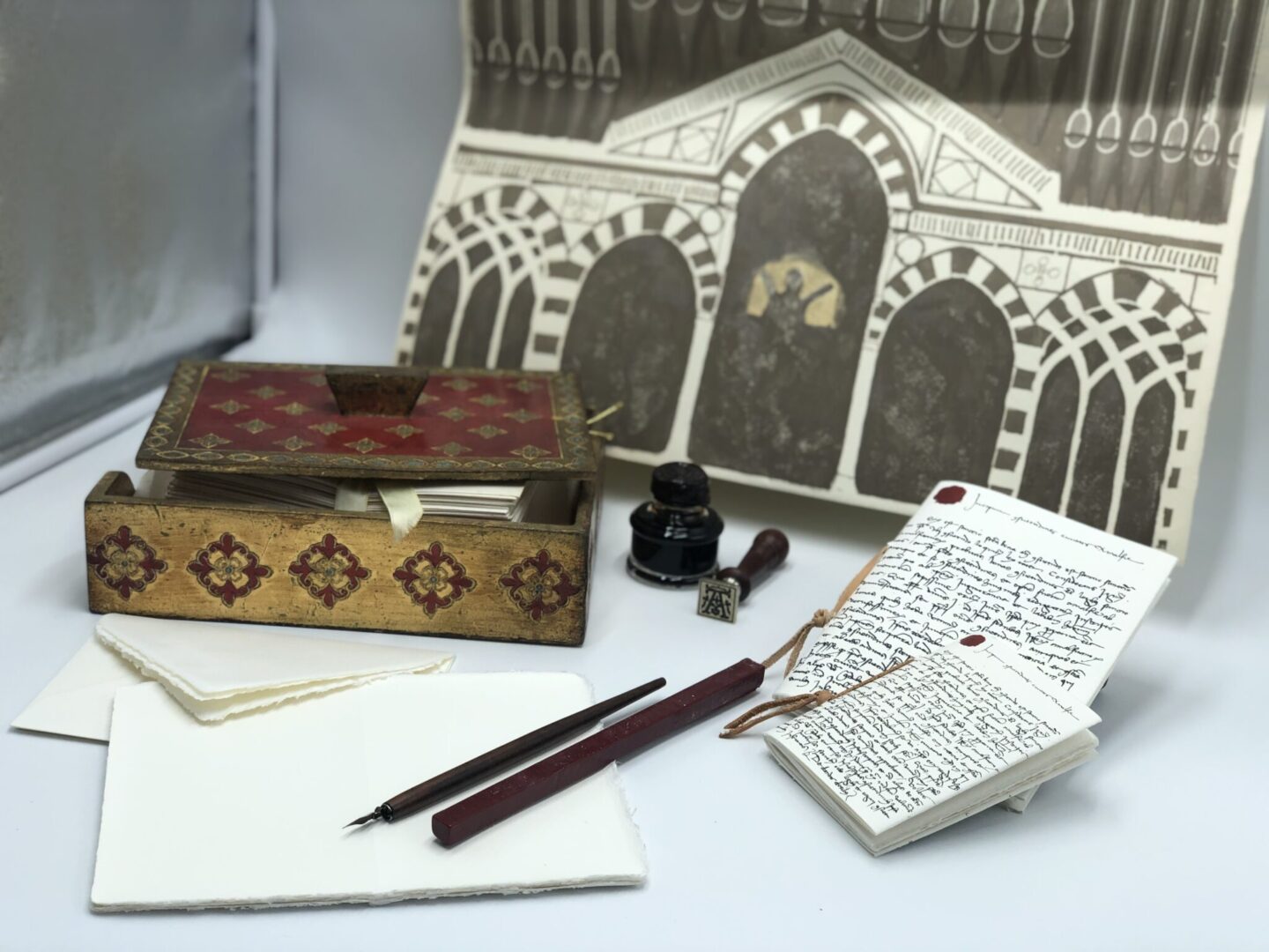 Fine stationery for writing letters should engage satisfyingly with the writing instrument being applied to it as well as take ink in a manner that best suits the writing method being employed. Water based inks, used by fountain pens and rollerballs, are especially suited for fine stationery. The proper selection of stationery for your writing enjoyment will ideally reduce or prevent altogether bleeding, feathering, and ghosting.