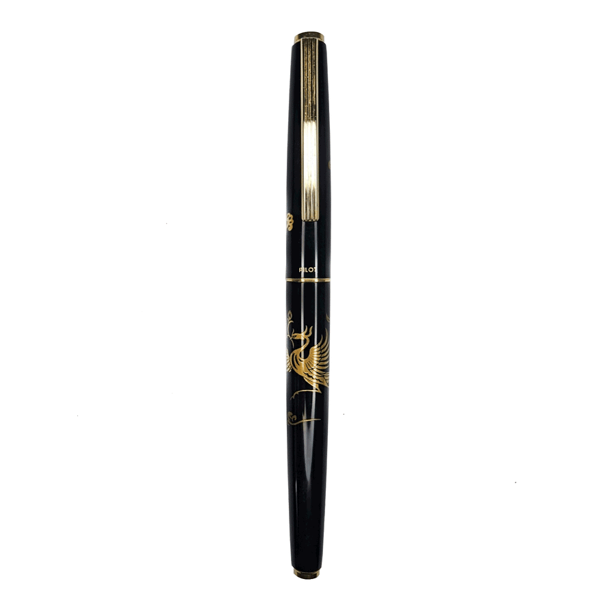 This vintage 1990 Pilot fountain pen rendered in beautiful maki-e depicts a flowing, stylized phoenix rising from a swirling, minimalist motif set against rich, black lacquer. Slim, elegant, and understated, this beautifully rendered fountain pen has managed to survive three decades after its release with almost no indication. Some age marks found on the clip, shown in the accompanying images, are all that would betray this handsome writing instrument as anything other than brand-new.