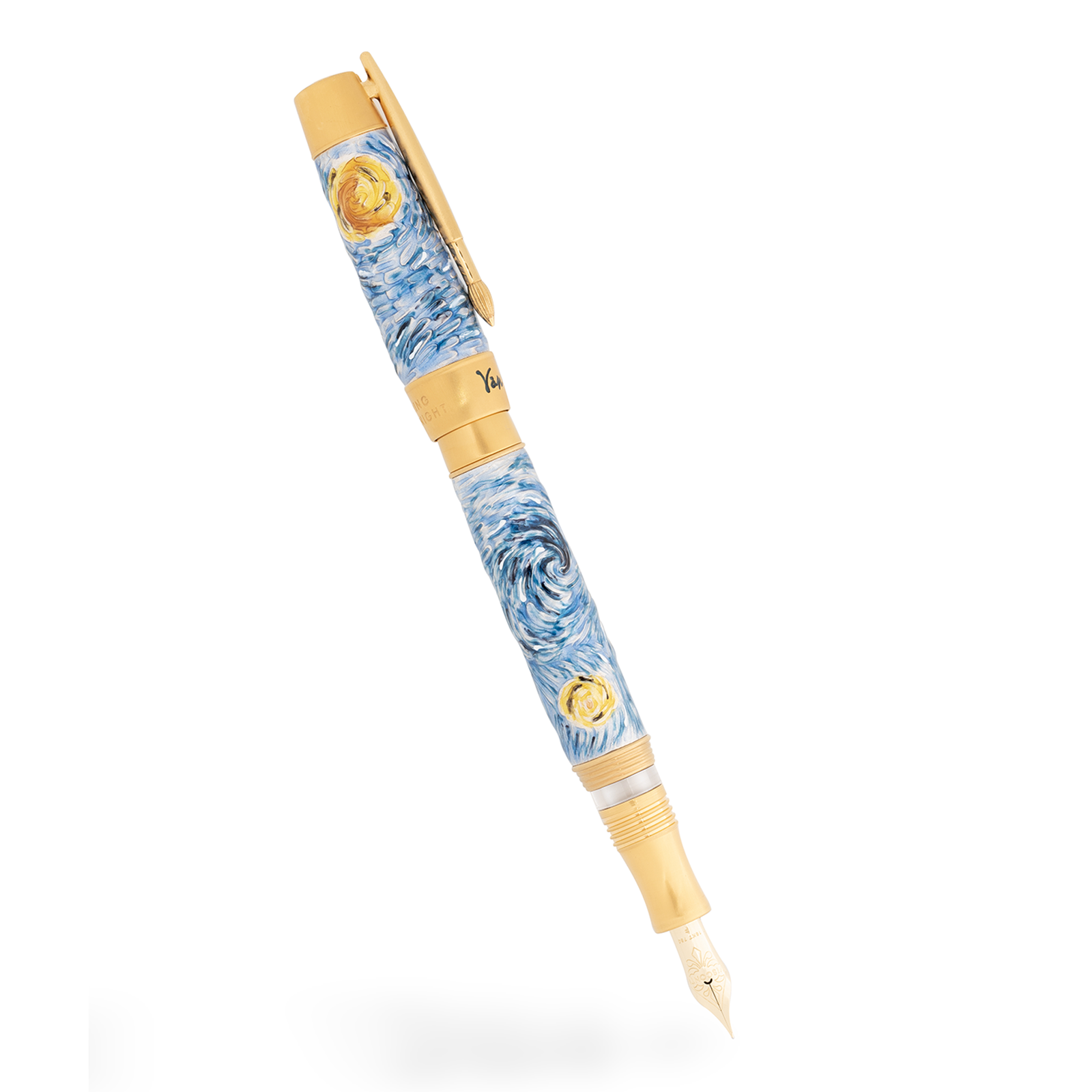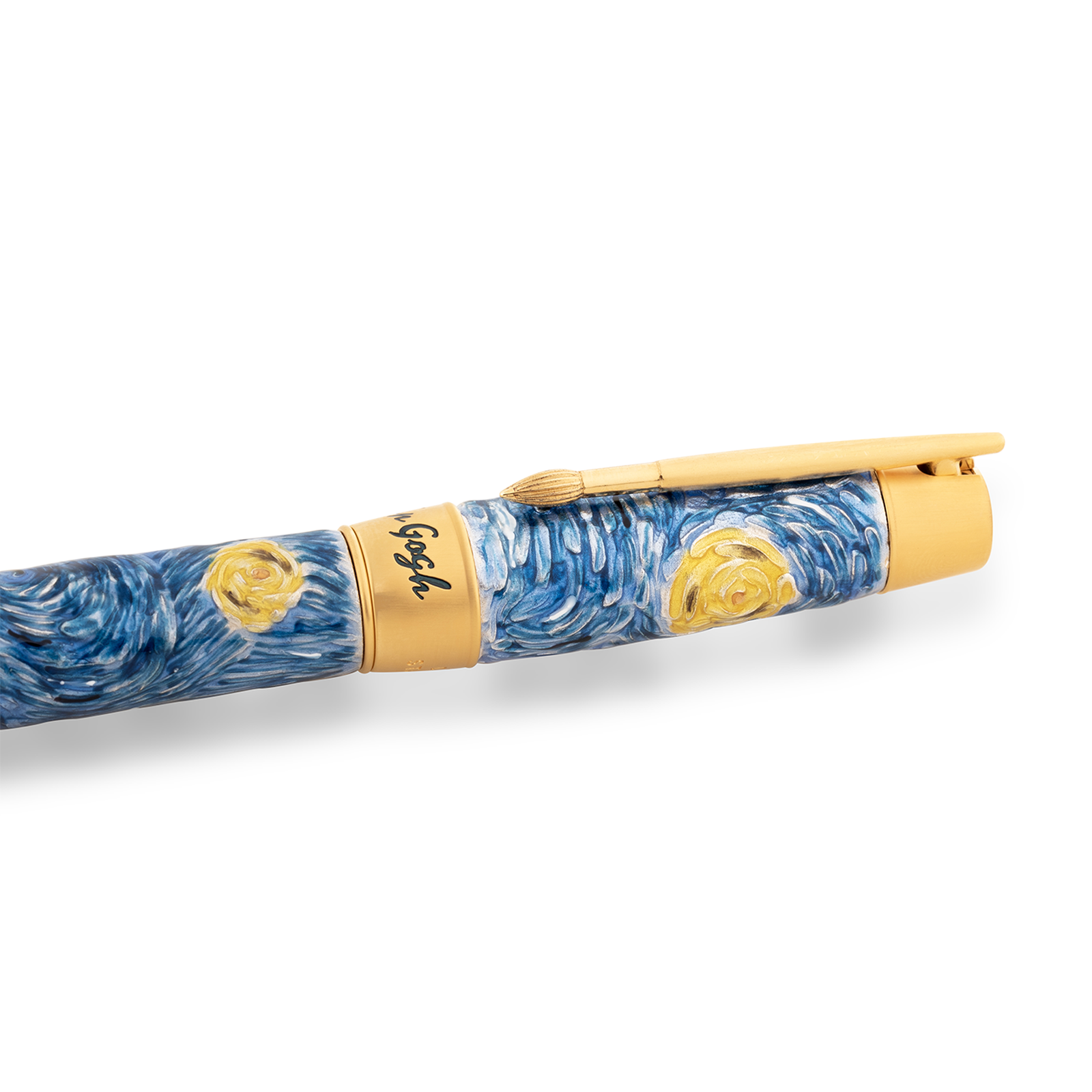 Even the smallest details of the Dreaming Starry Night are designed to celebrate art. In fact, the clip is a micro-cast in yellow gold-plated silver, representing a paintbrush, the painter's primary tool. The band features the artist's signature, engraved and highlighted with a blue enamel layer that elegantly contrasts with the yellow gold-plated metalwork of the pen.
