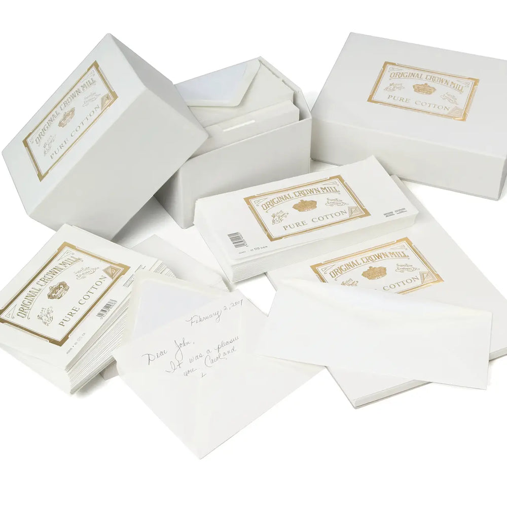 Pure Cotton stationery from the Original Crown Mill line is simple, 120g natural white cotton in a soft wove finish. The 25 envelopes coordinate with the A5 (5.75"x8.25") & A4 (8.25x11.75") Writing Pads and #40337 flat Note Cards. Lined in white tissue. Made in Belgium.
