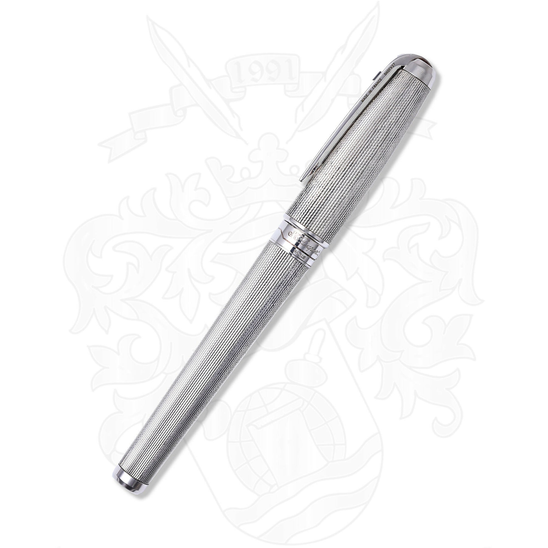Experience the height of S.T. Dupont’s craftsmanship with the Extra Large Olympio Silver-Plated Barley Grain Fountain Pen. This discontinued masterpiece represents a rare find in the world of luxury writing instruments, showcasing a meticulous barley grain guilloche finish over palladium.