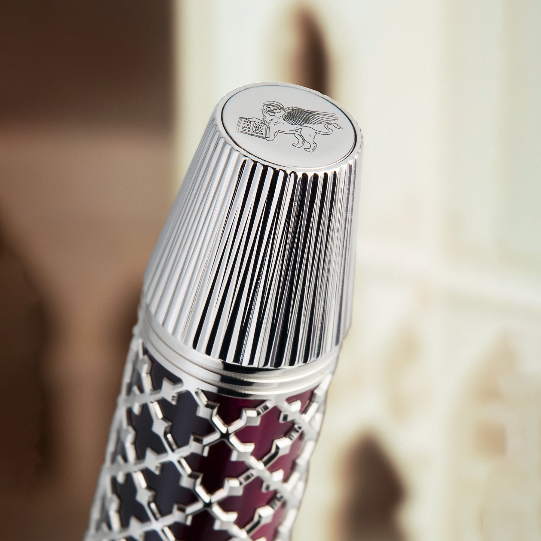 Each limited edition of 388 instruments is presented in a custom Bordeaux box. Its deep burgundy finish mirrors the noble tones of Venetian textiles, ensuring the presentation is as refined as the pen itself.