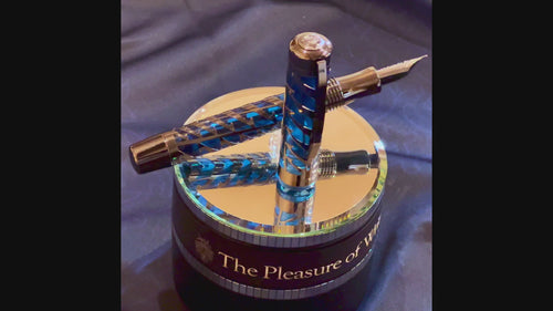 In the Limited Edition Watermark Blue Moon the Visconti logo looks like a paper filigree; the logo is repeated along the body and cap and cut out from a solid tube of sterling silver, which is then plated with ruthenium. Over 20 manual operations are necessary to give the pen its ultimate look. The sterling silver filigree is then placed over a cap and barrel made from translucent blue acrylic.